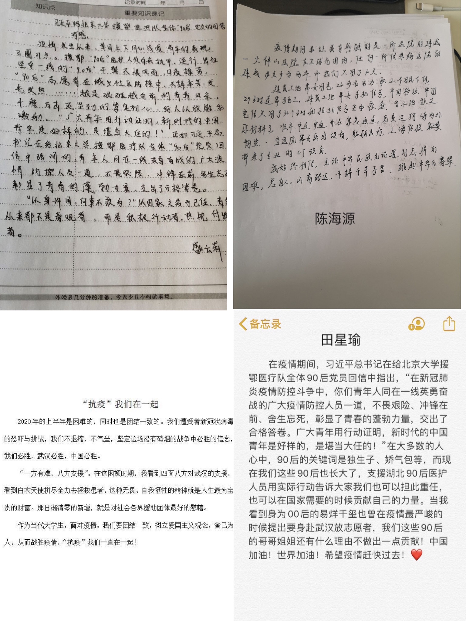 大三党员高婷婷表示,在读了“习近平给北京大学援鄂医疗队全体“90后”党员的回信后,深刻地意识到,国难当前,90后作为青年一代,是有担当的,责任感十足。时代的责任赋予青年,时代的光荣属于青年。在这次疫情期间,90后逆风成长。我们应该向这些人学习,利用疫情期间的大量时间充实自己,争取也为社会贡献一份自己的力量。