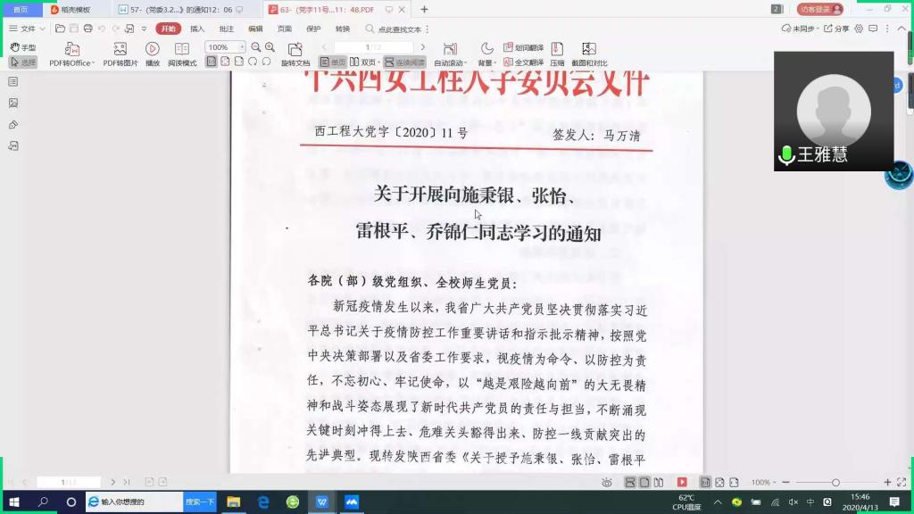 会上,王雅慧首先向大家传达了中共西安工程大学委员会关于转发《中共陕西省委办公厅关于开展向“三秦楷模”施秉银、付凡平同志和赵梦桃小组学习活动的决定》和《西安工程大学关于开展向施秉银、张怡、雷根平、乔锦仁同志学习的通知》精神并带领大家共同学习了先进典型的主要事迹。同时号召全院党员、教职工要以先进典型为榜样,她讲到:今年在疫情期间涌现了许多不畏艰险、身先士卒、甘于奉献的先进人物,其中也有很多是高校系统的医务工作者,当国家和人民有需要时,他们挺身而出、义无反顾地冲锋在前,战斗在抗“疫”一线,以实际行动践行初心使命。作为高校的教职员工肩负着立德树人的重任,一定要积极参加各党支部、系(实验中心)、办公室组织的学习教育活动。把向先进学习与本职工作结合起来,将学习内化于心、外化于行,立足本职,在自己的工作岗位上建功立业。