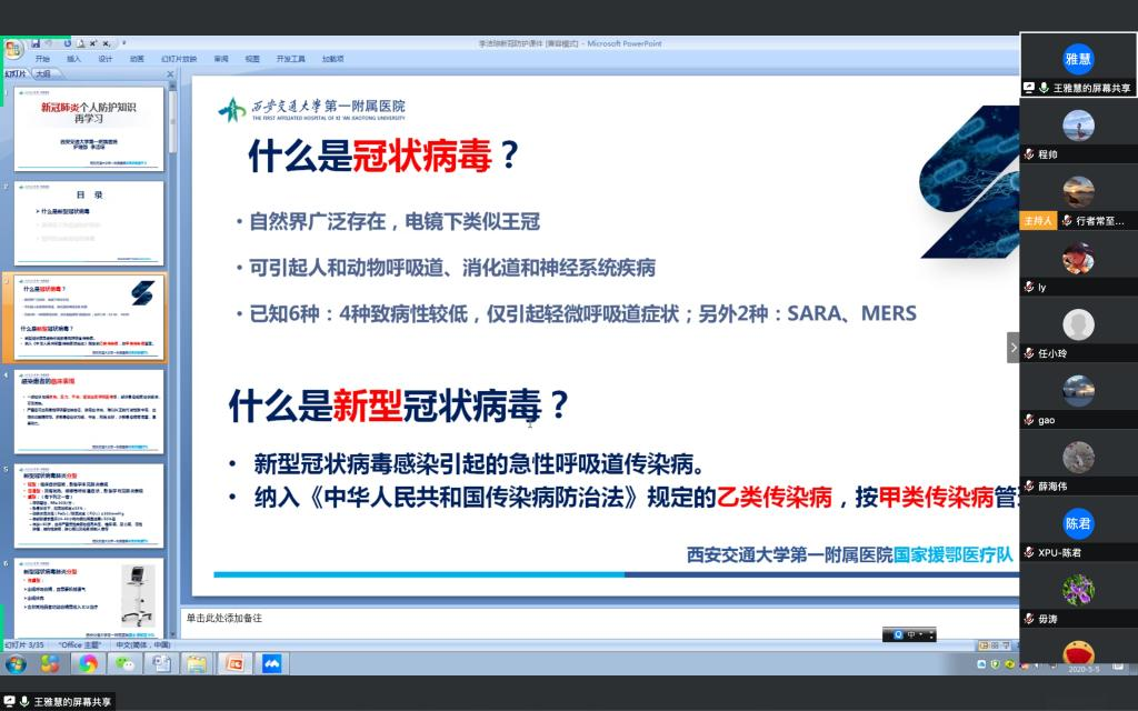 随后,王雅慧结合西安交通大学第一附属医院护理部副主任、西安交通大学第一附属医院国家援鄂医疗队成员李洁琼对我校的疫情防控培训的相关内容向全体教职工、党员进行了认真培训。同时,她带领全体教职工集中学习了《西安工程大学2020年工作要点》和《西安工程大学2020年教职工政治理论学习安排》并对学院本年度教职工政治理论学习工作做了相关安排。之后,对于学院稳定安全和疫情防控工作她还强调到:稳定安全无小事,疫情防控期间,全体教职工,特别是党员更发挥模范带头作用,保持清醒头脑,坚持底线思维,不能有侥幸心理和懈怠放松,在做好自我安全和防护的同时,也要积极为学院的安全稳定工作尽一份力,确保学院各项工作平稳有序开展。