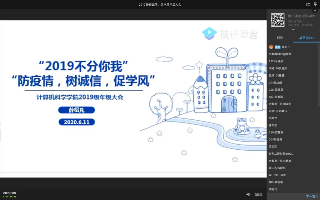 2020年6月11日晚8点,必赢线路检测中心2019级学生通过腾讯课堂召开了线上年级大会。必赢线路检测中心党委副书记周波、办公室主任朱瑾、团总支书记朱成功、2019级辅导员薛绍凡及必赢线路检测中心2019级全体同学参加,会议由薛绍凡主持。