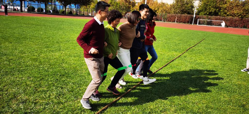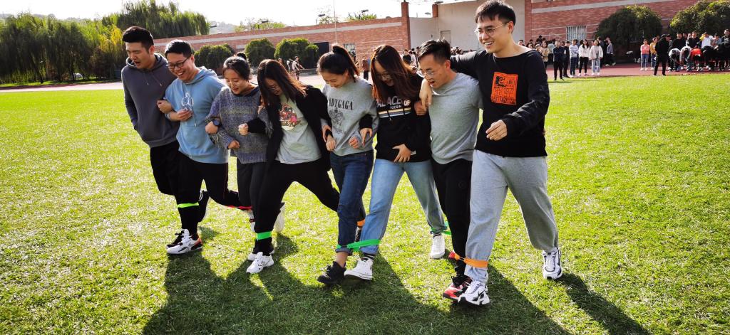 本次趣味运动会包括“结队同行”、“螃蟹背西瓜”、“拖球跑”、“双人踩气球”、“拔河”等5个比赛项目,所有项目均以团体赛的形式进行,共有三支教师队和十二支学生队参加了本次比赛。“结队同行”要求队员一字排开,相邻双腿绑在一起,协力跑向终点,对团队协作能力有很高的要求。“螃蟹背西瓜”和“拖球跑”采取接力形式,需要队员间协调配合,以最短时间跑过终点。双人踩气球采取两人一组,通过在规定时间内踩爆其他队伍脚上的气球,最终存活者取得胜利。比赛一开始同学们就组成了各自的阵营,战况异常激烈,最终以2019级的“铁桶”战术更胜一筹,赢得该项目的胜利。最后的压轴项目是拔河比赛,2020级和2019级的同学以班级为单位展开对抗,经过三轮角逐,最终在2020级1班同学胜利的呐喊声中,趣味运动会完满落下帷幕。